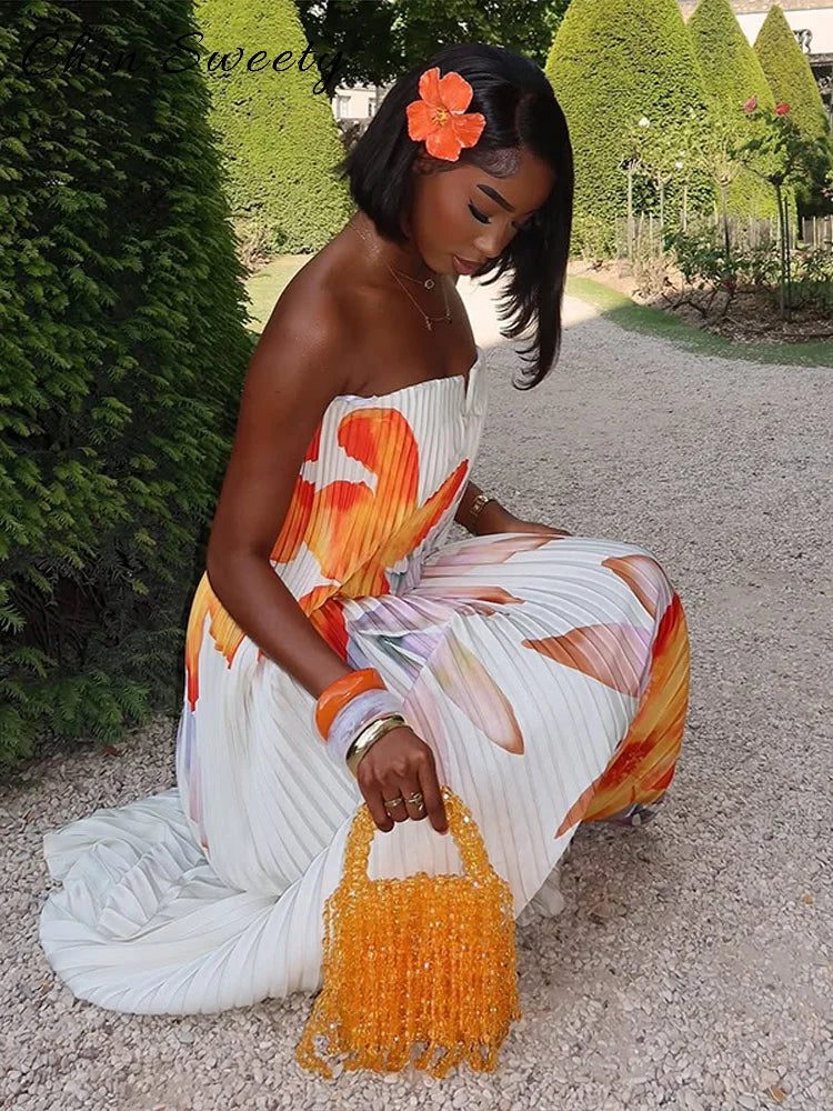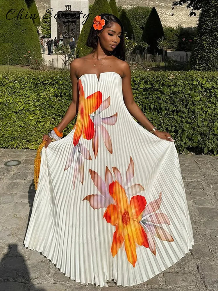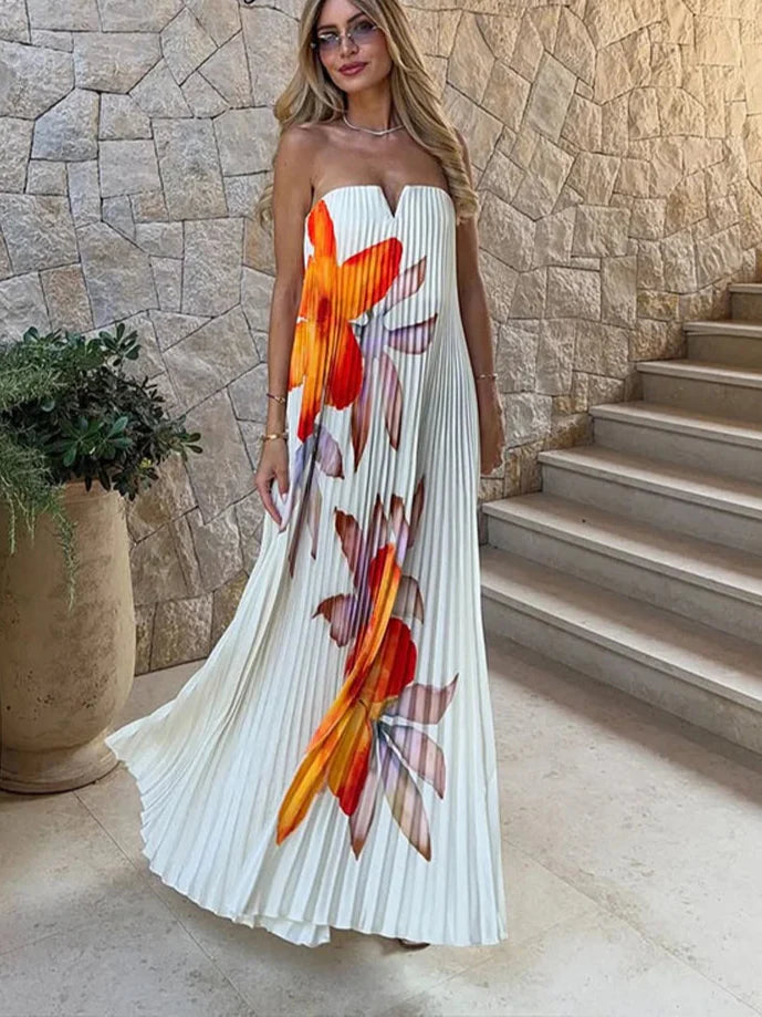 O destaque vai para a estampa floral vibrante sobre o fundo off-white plissado, criando um visual romântico e ao mesmo tempo impactante. O decote tomara que caia valoriza o colo com delicadeza, enquanto o corte solto garante conforto e liberdade de movimento.