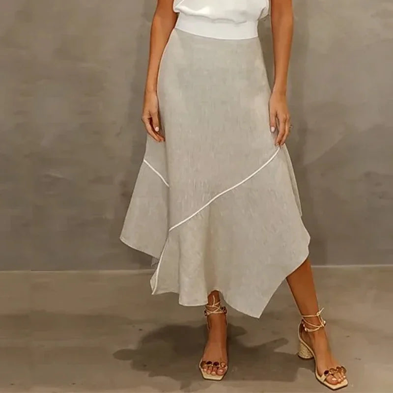 Saia midi evasê com recorte assimétrico e acabamento refinado