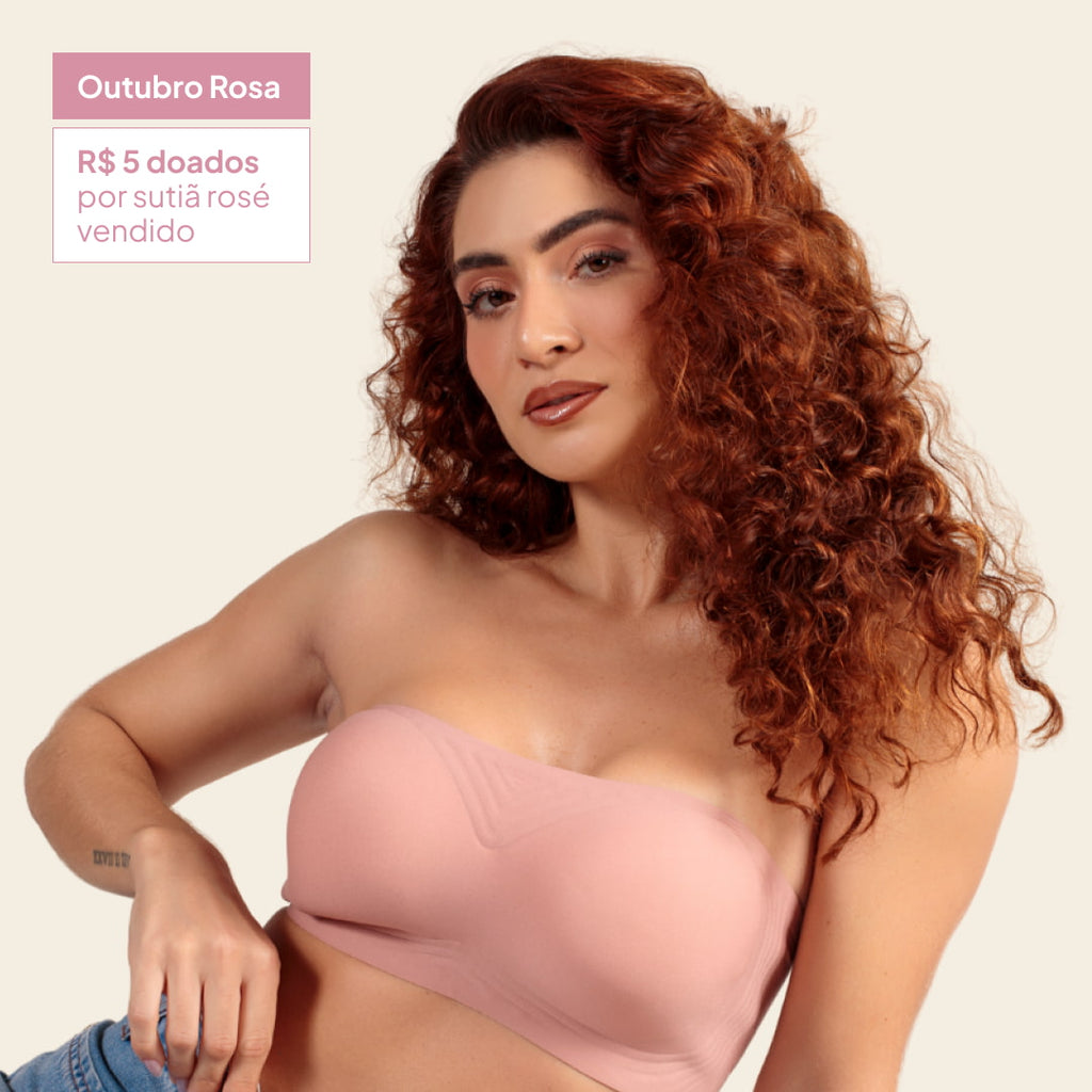 Um sutiã sem alças com sustentação segura, formato anatômico, faixas de silicone que são antideslizantes. Ele possui alças para adicionar, mais finas e compridas.