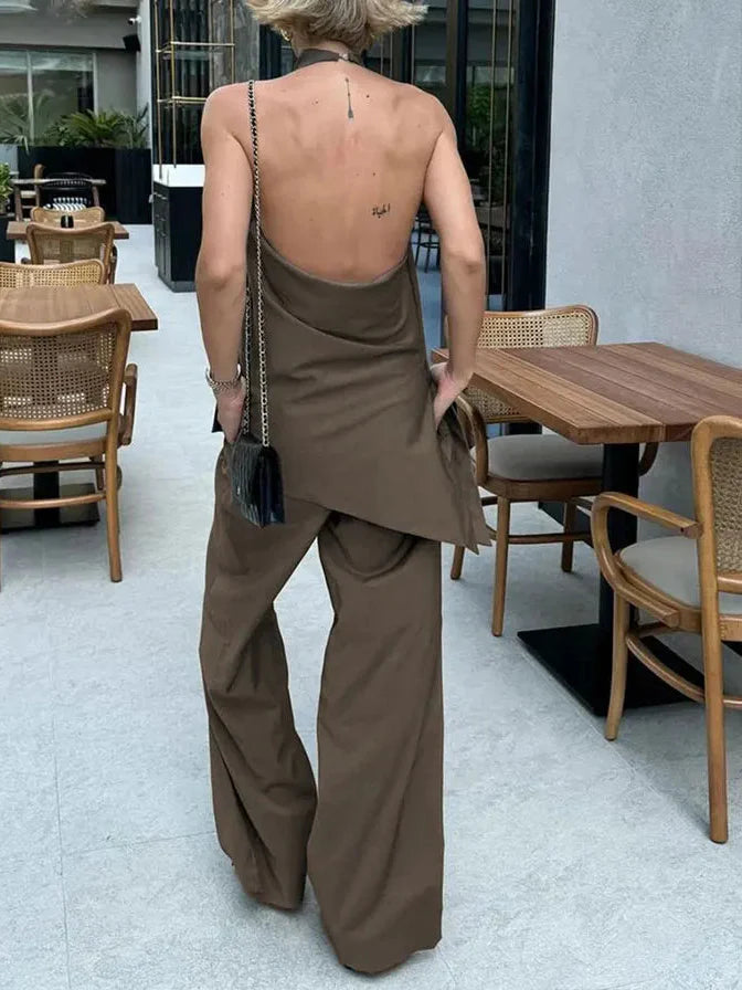 O Conjunto Jessy é o equilíbrio perfeito entre elegância minimalista e impacto visual. Com design moderno e recortes estratégicos, sua blusa de gola alta e costas totalmente abertas oferece um toque audacioso sem perder a classe. A modelagem fluida da calça pantalona alonga a silhueta e proporciona movimento leve e sofisticado.
