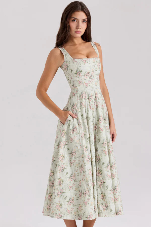 Com corpete estruturado na cintura e comprimento midi elegante, valoriza a silhueta de forma delicada e sofisticada.